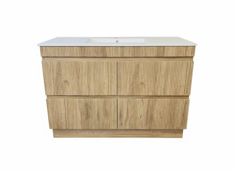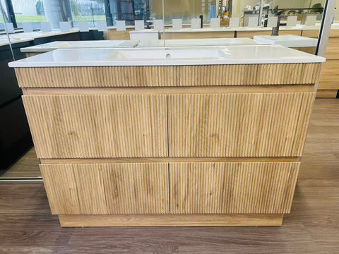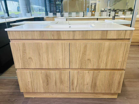 Elevate your bathroom with the striking Walnut 1200 Single Bowl Vanity. Designed with a fluted walnut finish and natural wood grain, this floorstanding unit offers a clean, modern aesthetic while maximizing floor space. Its double-bowl layout and premium plywood construction make it both stylish and functional—ideal for contemporary family bathrooms.